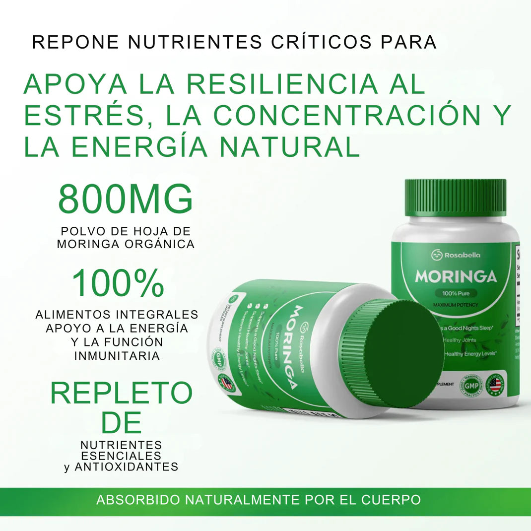 Rosabella Moringa™️ contiene moringa premium cultivada orgánicamente, rica en vitaminas B, C, hierro, magnesio y antioxidantes naturales. Su absorción rápida la convierte en un suplemento ideal para combatir la fatiga, fortalecer el sistema inmunológico y mejorar el descanso nocturno. Cada cápsula trabaja desde adentro para ayudarte a rendir más y sentirte mejor cada día.